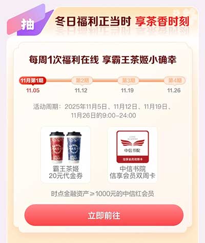 每周三,资产满1000元,抽:20元霸王茶姬,周限1次