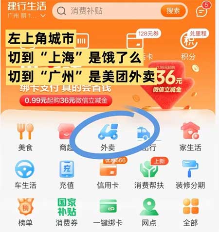 建行惠省钱20-10,用来点外卖也不错图首页“外卖”进去点外卖下单