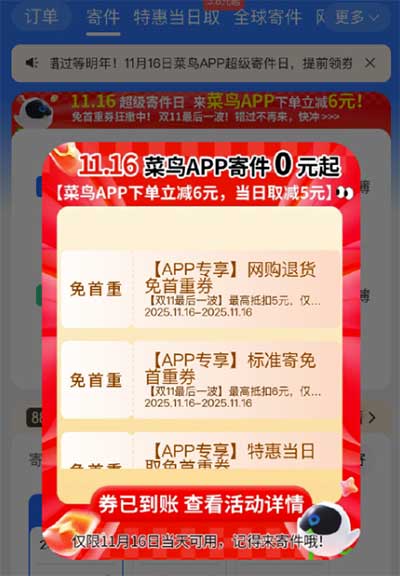 菜鸟寄包裹直接弹  16号可用