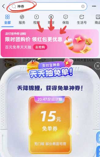 右下角的“天天抽免单”也可以顺便试一下,概率中15元免单券